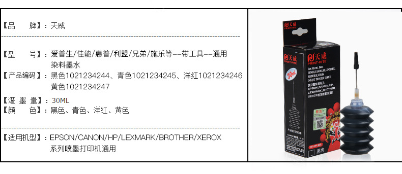 天威30ML墨水适用喷墨打印机照片彩色填充办公家用染料墨盒连供